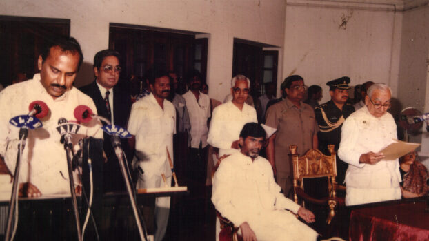 మంత్రిగా బొజ్జల గోపాలకృష్ణారెడ్డి ప్రమాణ స్వీకారం చేస్తున్న దృశ్యం