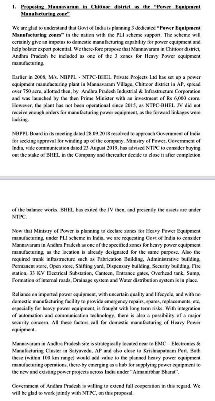 కేంద్రప్రభుత్వం ప్రస్తుతం దేశంలో మూడు ప్రతిష్ఠాత్మక విద్యుత్ ఉపకరణాల తయారీ జోన్లను ఏర్పాటు చేయడానికి సంకల్పిస్తోంది. ఈ మూడింటిలో ఒకటిగా మన్నవరం ప్రాజెక్టుకు అవకాశం కల్పించాలని గురుమూర్తి కోరారు. భారీ విద్యుత్ ఉపకరణాల తయారీ ఇక్కడ సాధ్యమవుతుందని విన్నవించారు.