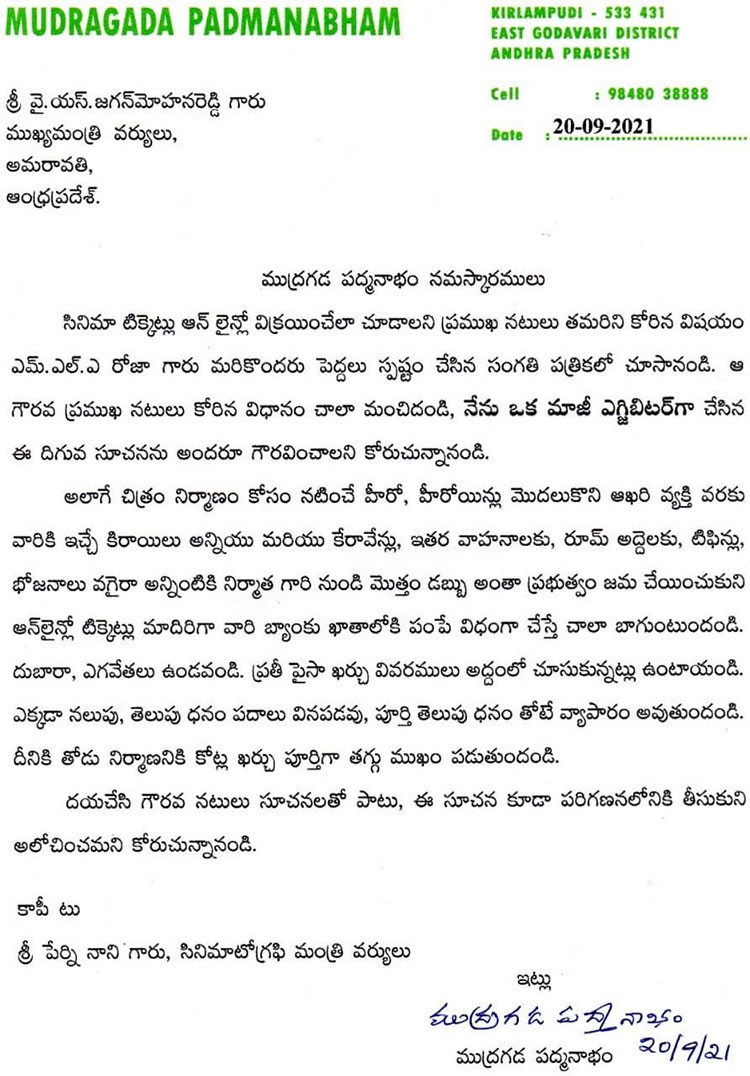 నాయకులు ఇలా మాట్లాడడం మీదనే, అంటే సినిమా వాళ్లు అడిగితేనే ఈ ఏర్పాటు చేశాం అనడం మీదనే బోలెడు సెటైర్లు పేలుతున్నాయి. ఆ నేపథ్యంలో ప్రతి విషయాన్నీ తనదైన శైలిలో దెప్పిపొడుస్తూ విమర్శలు చేసే సీనియర్ నాయకుడు ముద్రగడ పద్మనాభం ఒక లేఖ రాశారు.